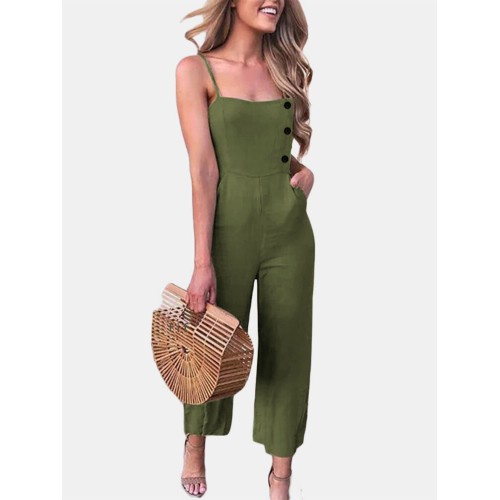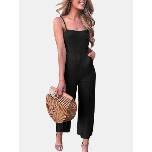 Solid Color Button Pocket Zipper Strap Sleeveless Loose Casual Jumpsuit