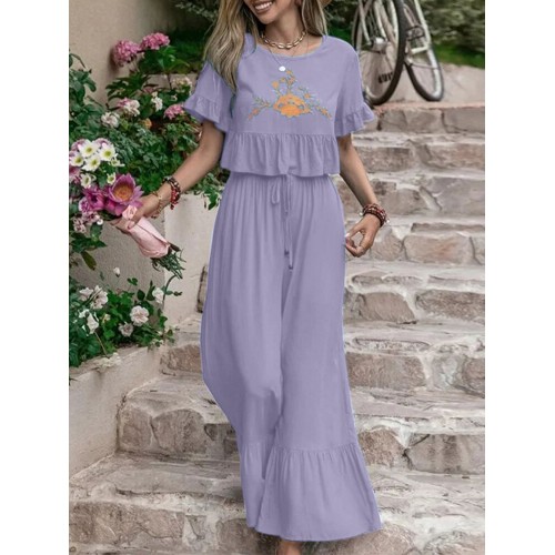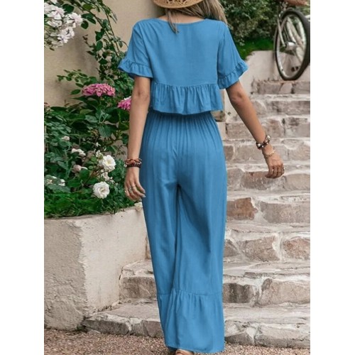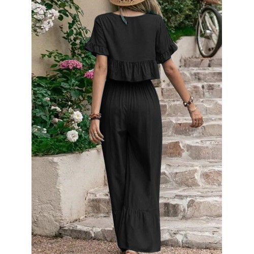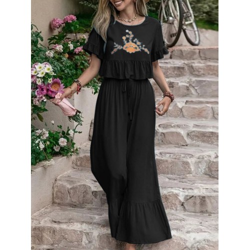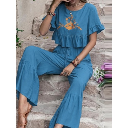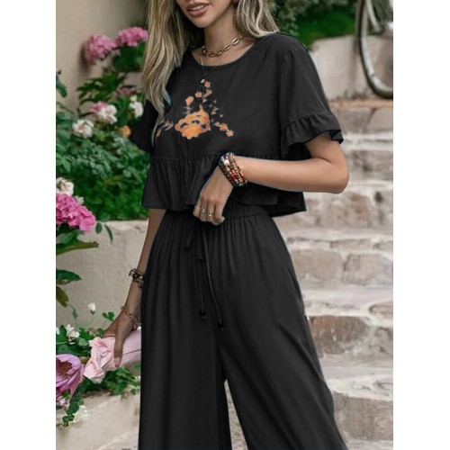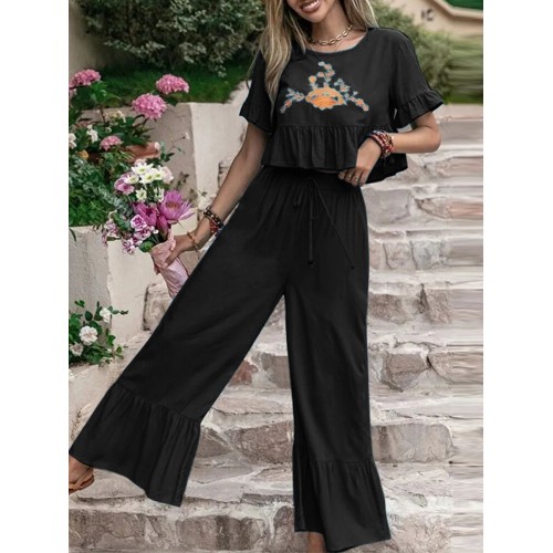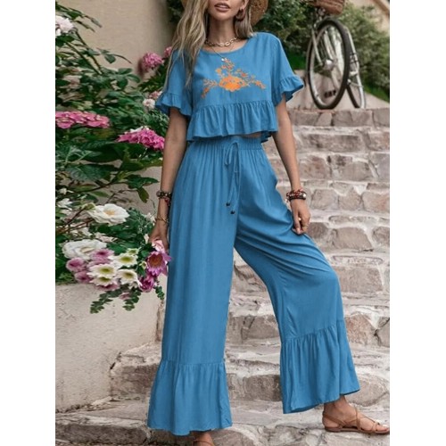 Embroidery Drawstring Waist Ruffle Wide Leg Two Pieces Suit