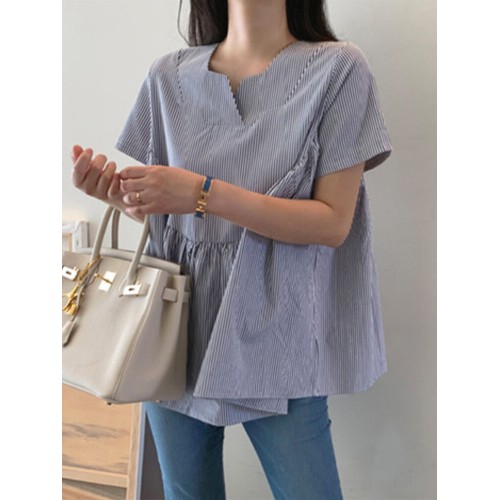 Stripe Print Notch Neck Short Sleeve Loose Blouse
