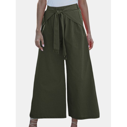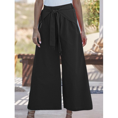 Solid Color Lace up Wide Legged Elastic Waist Cotton Pants