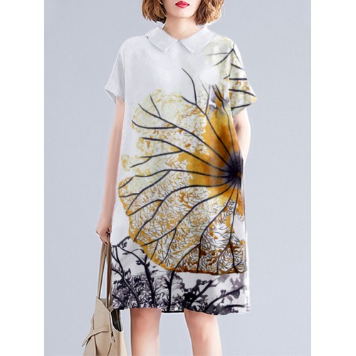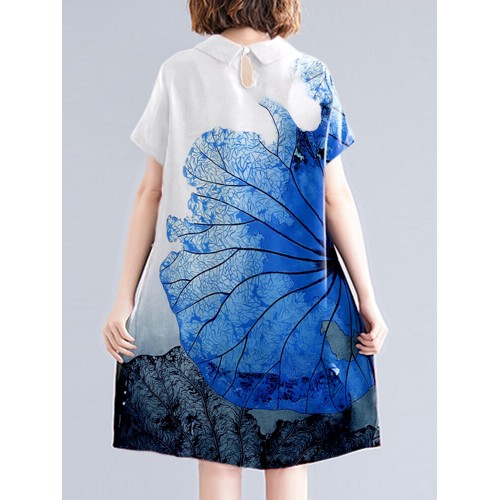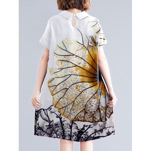 Leaves Print Peter Pan Collar Pocket Keyhole Back Dress