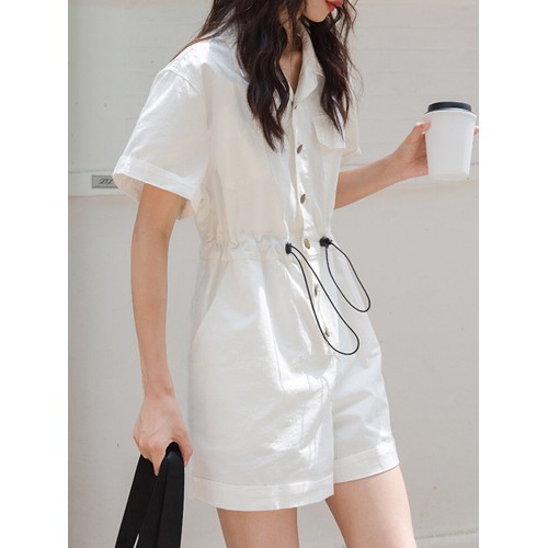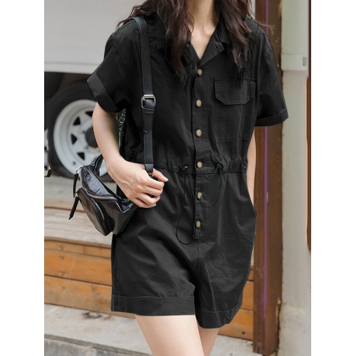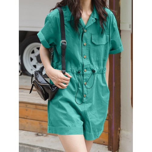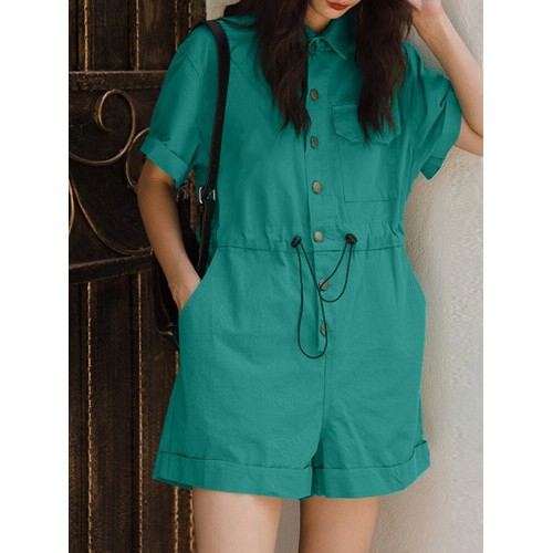 Solid Drawstring Waist Pocket Lapel Short Sleeve Cargo Romper