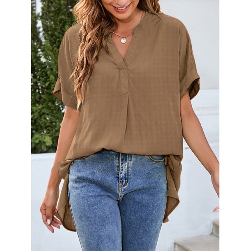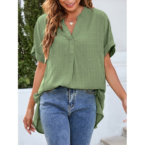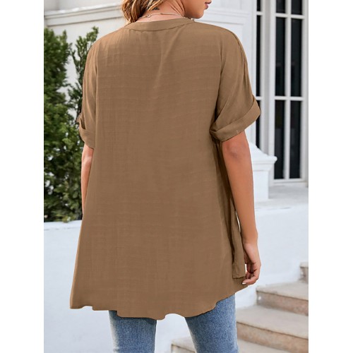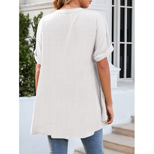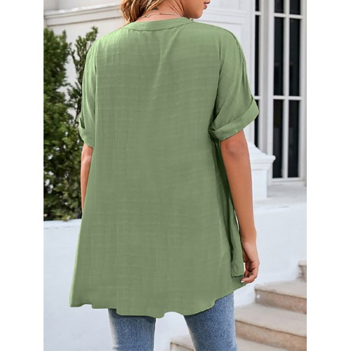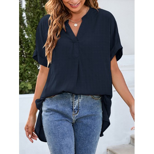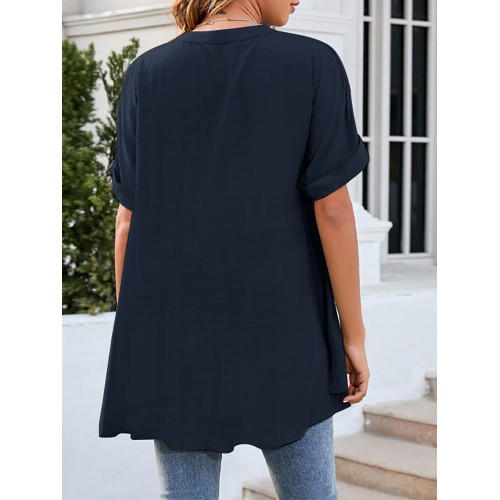 Solid Split Roll Sleeve High Low Hem Casual Blouse