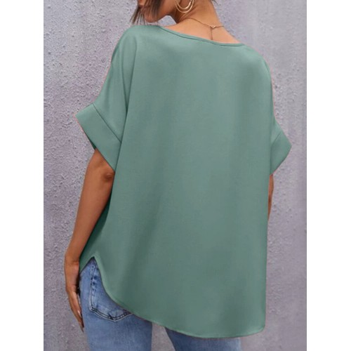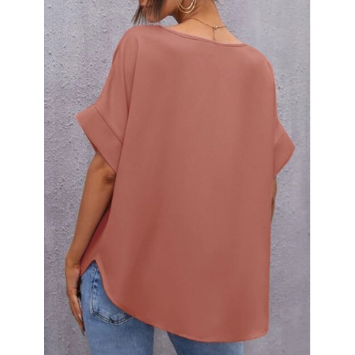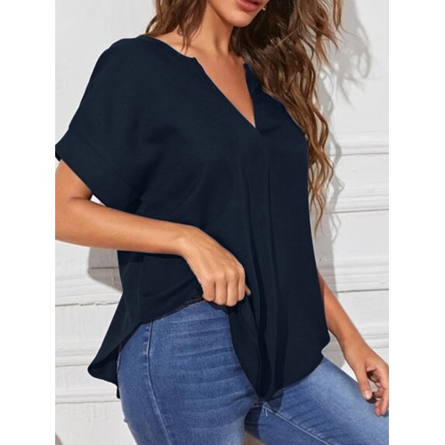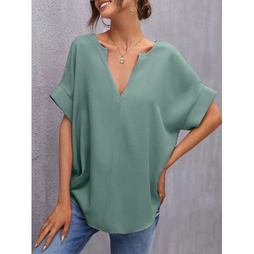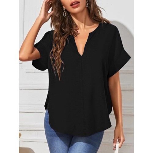 Solid V Neck Short Sleeve Loose Casual Blouse