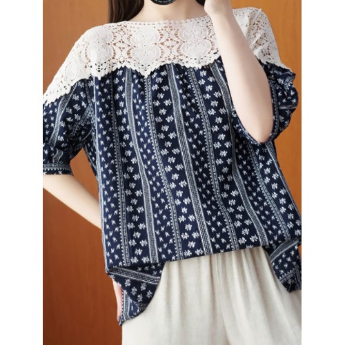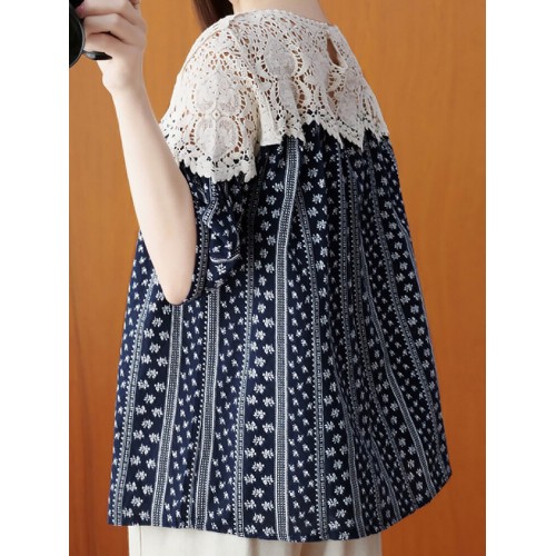 Stripe Lace Patchwork Half Sleeve Round Neck Blouse