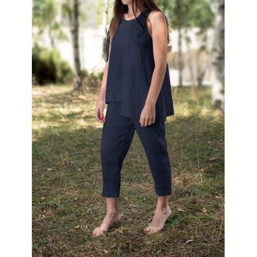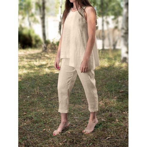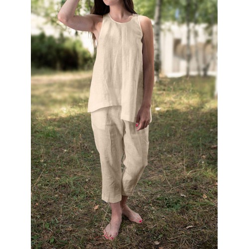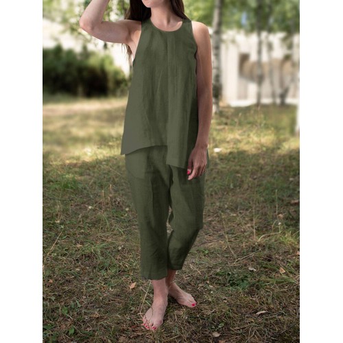 Solid Round Neck Sleeveless Irregular Hem Casual Cotton Suit
