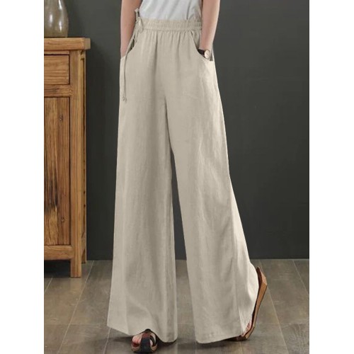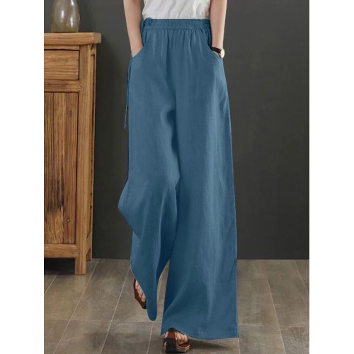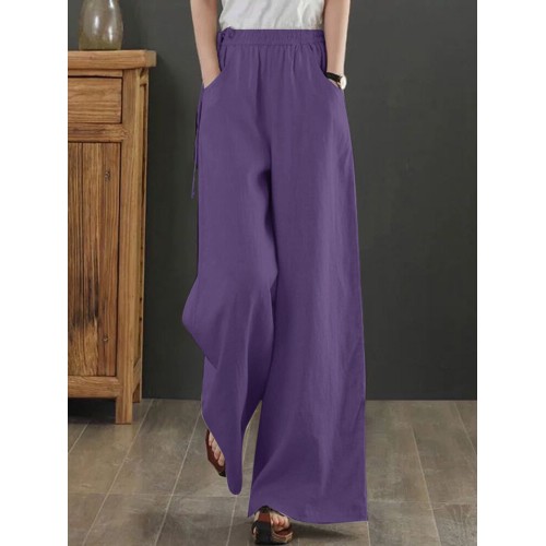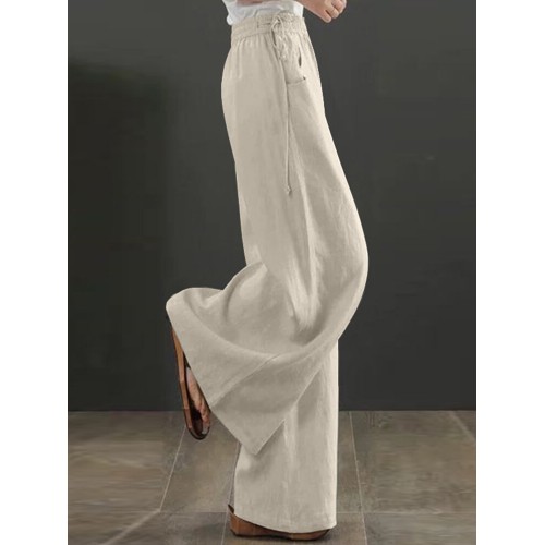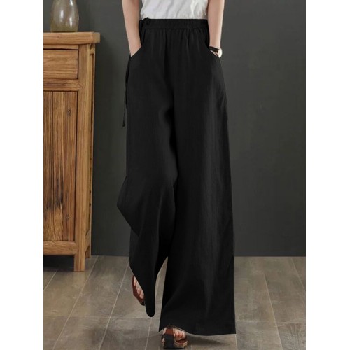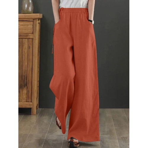 Women Solid Drawstring Waist Pocket Wide Leg Pants