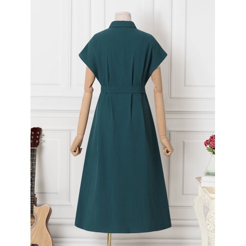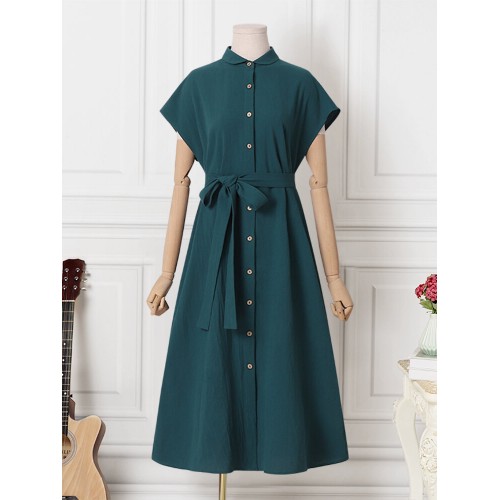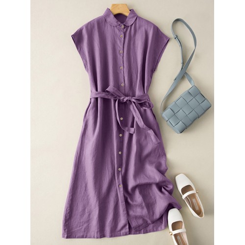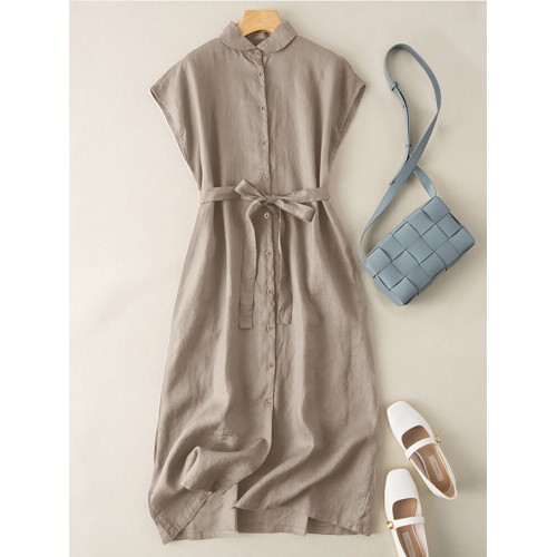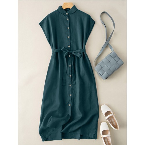 Solid Button Sash Lapel Short Sleeve Casual Cotton Shirt Dress
