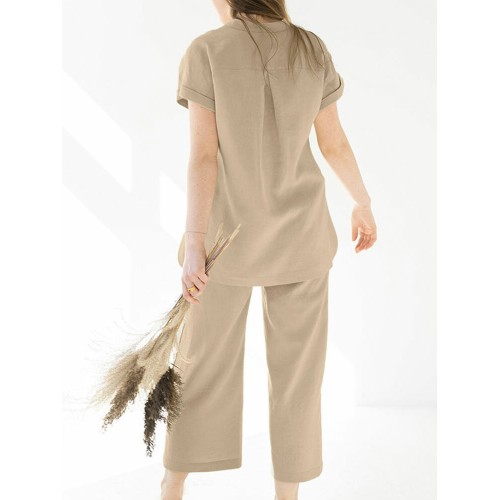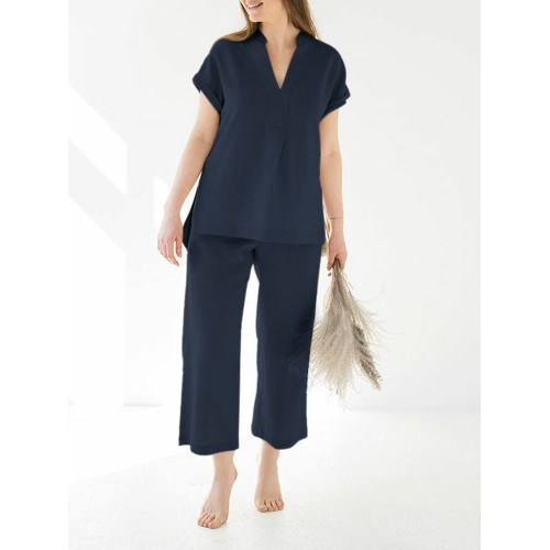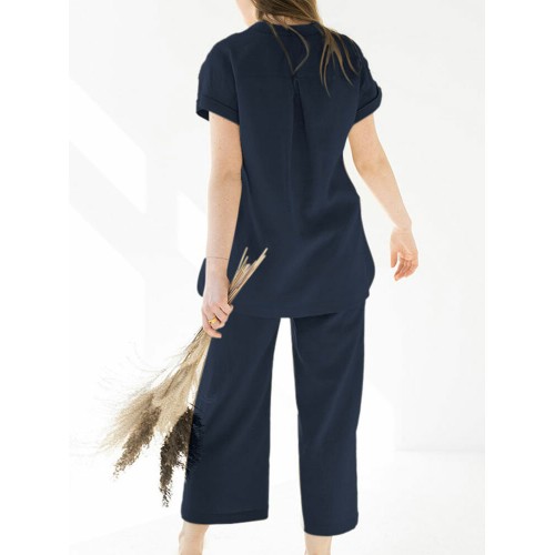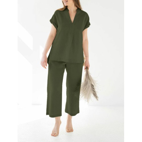 Leisure Solid Split Elastic Waist Short Sleeve Cotton Suit