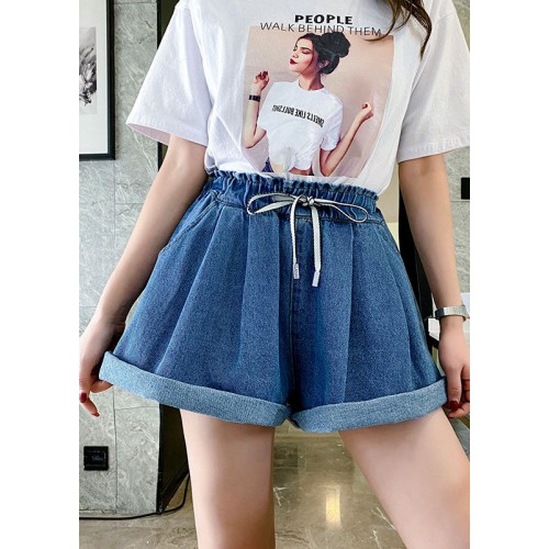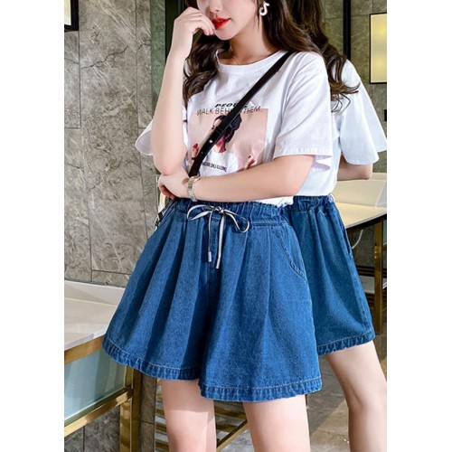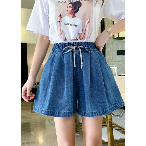 Simple Navy Elastic Waist drawstring Pockets Cotton wide leg Pants Shorts Summer