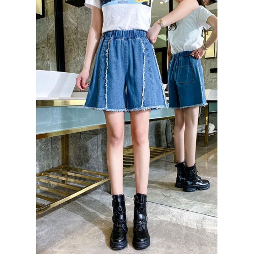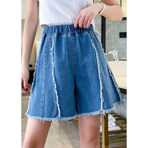 Modern Blue Elastic Waist Patchwork Tassel Cotton Denim Hot Pants Summer